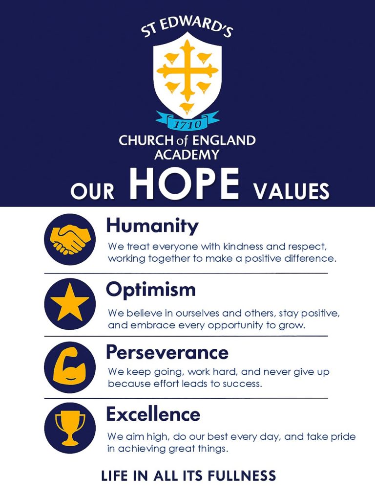 Our curriculum for life in all its fullness is designed to equip children to be curious and confident independent learners but also responsible, resilient and caring citizens in their community. As they leave St Edward’s Academy, we want every child to be ready to take on the next steps in their journey to adulthood with a love of learning, positive attitudes and a rounded set of values and skills to guide them. This is achieved through our HOPE values; Humanity, Optimism, Perseverance and Excellence.